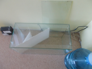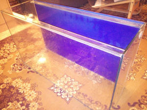 3) Четыре аквариума по 30л (35см * 35см *25см) в отличном состоянии (не текут), есть ребра жесткости, стекло 4мм. Есть особенность: в одной из боковых стенок вверху просверлено аккуратное круглое отверстие (использовалось для системы фильтрации.) Также наклеен фон (синий внутри, черный снаружи, можно при желании переклеить другой стороной). по 200 рублей.