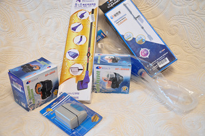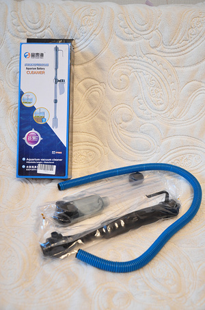 4.Очиститель грунта (сифон) на батарейках. Вода засасывается в корпус сифона с помощью электрической помпы получающей питание от батареек расположенных в рукоятке устройства. Частицы грязи задерживаются в грязевом мешке, после чего очищенная вода выливается обратно в аквариум. Также можно соеденить шланг для слива воды. Для аквариумов от 30 до 60 см высотой.