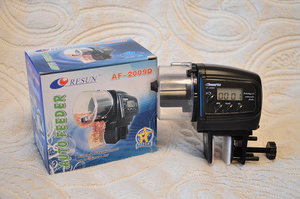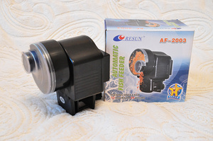 1.Автоматическая кормушка для аквариумных рыб RESUN AF-2009D. Используется для сухих кормов, таблеток для сомов. Автокормушку можно прикреплять на стенку аквариума любой толщины, кронштейн крепления идет в комплекте. Автокормушка умеет высыпать сухой корм в аквариум по таймеру 4 раза в сутки, барабан может повернуться один или два раза за каждое кормление, количество высыпаемого корма тоже регулируется.