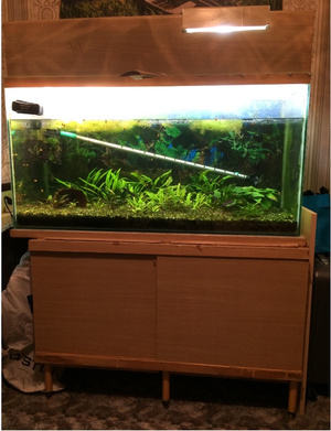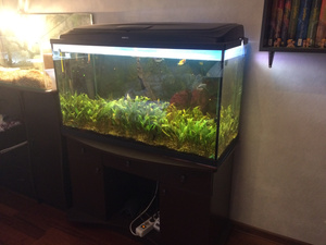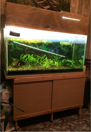 Продам аквариум с тумбой, примерно 200 литров, длина 100 ширина 40 высота 55. внутри 4 гурами и анцитрус, обработанная коряга, растения, грунт. Вся техника Tetra: фильтр tetratec in 1000 plus, терморегулятор tetra HT 25-300, компрессор tetratec 300. лампы Aqua-Glo и Sun-Glo недавно заменены. Аквариуму примерно 5-6 лет, нет никаких трещин, сколов, немного налета от воды на стекле. В крышке самостоятельно были сделаны отверстия для внешнего фильтра (использовался ранее). Тумба сама светлого цвета, но была покрашена в темный, размеры соответствуют аквариуму. Аквариум продается полностью, с самовывозом помогу, с ж/д вокзала. 10000 возможен разумный торг. 89513948606