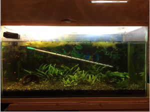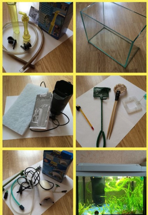 В комплект входит: крышка с лампами (энергосберегайки), тумба самодельная, металлический каркас, внутренний фильтр, грунт (мелкая галька), все растения которые на фото