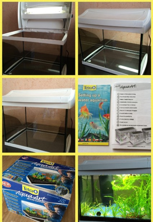 1)Аквариум Tetra Aqua Art 20 л белый. Габариты – 39,5 x 28 x 33 см. Вес - 5 кг. Толщина стекла - 3 мм. Освещение. Фильтр внутренний Tetra Еаsy Crystal 250 (инструкция), минус – после выключения и последующего включения может не сразу начинать работать. К нему фильтр картридж (синтетическая ткань), размер 16 см на 32 см, хватит на 5 раз использования. Инструкция к аквариуму. Коробка, размеры 39 см * 29 см * 33 см.