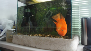 Здравствуйте уважаемые аквариумисты! В связи с внезапным отъездом на длительный срок нужно найти новый дом для нашей питомицы - красной попугайхи, зовут Морковка. Морковка живет у нас уже более 6 лет. Было два попугая, но напарник умер от старости пару лет назад. Рыба хорошая и ухоженная, крупная, кушает хорошо, здорова!