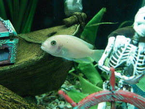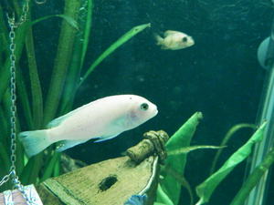 Покупала ещё детками, название к сожалению, не помню. Продавец сказала, что повзрослев, рыбсы будут похожи на цихлид-дельфинов, однако они по-прежнему серого цвета, слегка желтеет плавник по верхнему краю.Может уже не актуально но это самка плацидохромиса.