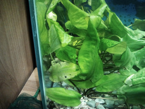 Стал замечать что растениям как то плохо в банке. Они стали как бы ниже, стелятся по камням. Замечаю дыры в листочках и даже некоторые листья отгнивают. Правда новые листочки активно вырастают. А замечать я это стал после смены освещения или это совпало. Раньше стояли люминисцентные круглые лампы, 2 шт. мощность их не знаю. Проводка сгнила, лампы пропали. Заменил на обычные лампы холодного света Е27 15W 5000К. Две штуки. Фото, видео прилагаю. Вот и вопрос а это много света или мало? Светят по 12 часов в день. Или может дело не в этом. Сифоню с подменой делаю раз в неделю. Меняю 10 литров воды.