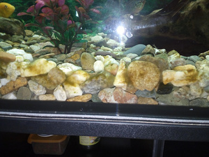 цихлидник с таким фильтром (могу ошибаться но уж очень слабеньким выглядит) = куча не переработанной органики. Думаю стоит подумать о внешнике, либо заморачиваться с еженедельными 20% подменами. Или внешник есть (на первом фото трубки какие то справа)?