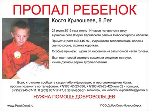 Потерявшийся в лесу днём в пятницу 21 июня 8-летний Костя Кривошеев http://vk.cc/1BIYXi пока не найден .