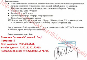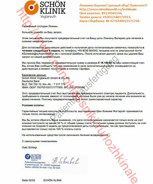 Здравствуйте! Я мама маленькой Лерочки! Хочу поделиться с Вами нашей страшной трагедией. На данный момент нам поставлен диагноз: Симптоматическая фокальная лобная эпилепсия фокальные приступы со сложной симптоматикой, исходящие из левой/правой? лобно-височной области. Фармакорезистентность. Задержка психоречевого развития с регрессом на фоне эпилепсии. Лерочка наша долгожданная, очень желанная девочка! Без нее мы не представляем жизни, она наш лучик света, солнышко, безграничное счастье!!! И просто думать страшно, и тем более видеть, как ее «пожирает» болезнь… Ничего нет хуже, чем видеть страдания своего ребенка! Её слезы… Смотреть в ее молящие о помощи глаза, и знать, что не можешь ей помочь, т.к. все упирается в эти злополучные деньги! Жизнь ребенка измеряется деньгами! Доченька родилась в срок, путем планового кесарево сечения, плод крупный и тазовое прилежание 9 месяцев. На пятые сутки, как и положено нас выписали домой. В 4 месяца пошли замирания, но диагноз никто не ставил. Лера развивалась по возрасту. В 9 месяцев потеряла сознание, и нас доставили в неврологию, взяли анализы, сделали ЭЭГ, но ничего не нашли, и нас отправили домой. А ближе к году начались страшные приступы с перекосом лица и провисанием правой стороны. Такого ужаса я не испытывала никогда!!! В "Синеглазке" нам поставили диагноз "Эпилепсия". Это был как гром среди ясного неба! Я даже в самом страшном сне не могла представить, что такое горе коснется мою семью. И после этого жизнь моей доченьки превратилась в настоящий кошмар! Постоянные обследования, коррекция терапии, плановая госпитализация 2 раза в год в неврологию. И с каждым годом Лере становилось все хуже. Приступы росли, учащались и видоизменялись. Доходило до 60 приступов в день. Постоянные обследования ЭЭГ результатов не давали. Мы делали 2 раза в 2011 и 2013 годах МРТ головного мозга в клинике Мешалкина, но и там ничего не нашли. С конца 2012 года пошли приступы с падениями и потерей сознания. В одном из таких приступов не успели подхватить дочь, и она при падении разбила голову, ездили в детскую травму на Красный проспект, наложили швы. После таких приступов дочь начала сильно отставать в развитии, буквально за считанные месяцы она перестала говорить, ходить на горшок, держать ложку, пошел дефицит моторики в правой руке. Можно сказать, что правая рука просто болталась, так как делать ей дочь ничего не могла. После этого мы обратились в Федеральный центр нейрохирургии. Там нам сделали операцию "передне-срединную каллезотомию", но, к сожалению, должного эффекта это не принесло. В первом месяце приступы начали уменьшаться в размерах и количестве, но через месяц все вернулось опять. На данный момент количество приступов доходит до 10 раз в сутки, мы не говорим, не держим ложку, не просимся на горшок. Опять коррекция терапия, но эффекта нет. Наши врачи разводят руками. На российском оборудовании не видно эпилептический очаг. А если его удалить, то по прогнозу врачей, ребенок полностью восстановится. В России шансов нет…. По настоянию нашего лечащего врача-эпелептолога к.м.н. Волкова И.В.** обратились за помощью в Германию. В клинике Schon Klinik Vogtareuth нам выставили счет на обследование 18180 евро. Эта клиника специализируется на неврологических проблемах, в т.ч. на эпилепсии. Там очень мощное оборудование – мозг виден, «как на ладони