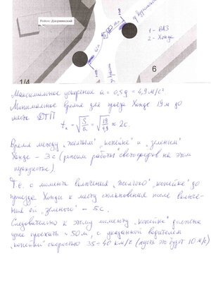 Копейка проехала 42 м, хонда - 19 м. С указанной водителем копейки скоростью (35-40 км/ч - пусть это будет 10 м/с) за время между желтым копейке и зеленым хонде (это около 4 с. - сам замерял), копейка проехала бы со стоп-линии 40 м, до того момента, когда хонде должен был загореться зеленый, т.е. если бы водитель копейки не нарушал, то на месте столкновения был бы в момент, когда хонда только начала движение со своей стоп-линии