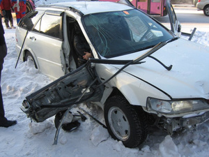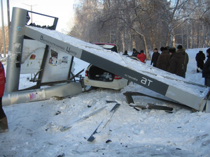 "Я являюсь очевидцем этого происшествия, и хочу изложить ситуацию. Мы (я и "Аккорд") ехали со скоростью 30 км/ч от светофора на перекрестке Пирогова-Лавреньтева к ВЦ рядом . Метров за 100-150 до перекрестка у ВЦ водитель "Аккорда" (девушка) начала меня потихоньку опережать по своему левому ряду (я ехал в правом), расстояние между нами достигло 15-20 метров (она впереди). Примерно напротив павильона остановки ее автомобиль дважды бросило, как раз в этой самой колее, после чего машину развернуло поперек движения и вынесло на встречную полосу. Ехавший со стороны Морского проспекта "Мерседес" (тоже со скоростью не более 30 км/час) врезался в водительскую дверь "Аккорда", в результате чего "Аккорд" еще больше развернуло в сторону пр.Строителей. После удара "Аккорд" резко набирая скорость (возможно, вследствие того, что девушка уже потеряла сознание или из-за деформации "закусило" педаль газа), врезался в павильон остановки, снес его и застрял в сугробе, чудом не задев работавших там мужчин. Я первым подбежал к машине. Девушка была без сознания. Водительская дверь была сильно деформирована и не открывалась, двигатель работал на больших оборотах, через пассажирскую дверь я заглушил двигатель. Уже собравшиеся люди отрывали водительскую дверь. Я туда уже подойти даже не мог. Сказали, что скорую помощи вызвали и я пошел убирать свой автомобиль с дороги, потому что бросил его, едва успев включить аварийку и не закрыв автомобиль. Все это я могу повторить в качестве показаний свидетеля, если понадобится. Мое мнение - если бы колеи не было, всего этого сорее всего могло и не случиться. Более опытный водитель, наверное, избежал бы такого исхода, но прямой вины водителя в данной ситуации нет."