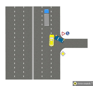 Зачем пытаться предугадать поведение жёлтой машины?! Он едет по главной, пусть как хочет так и едет. А синему можно подождать Х-секунд и проехать без аварий и нервов. Из-за 10-30 секунд, потом стоять от 30 минут ждать ДПС, оформление, ремонт авто... Только из-за нетерпеливости... Вам не кажется, что овчинка выделки не стоит?!