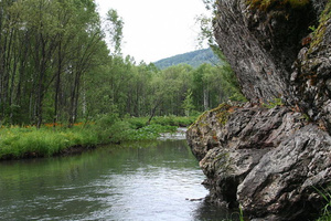 16-08, ровно 600(!) км от Новосибирска - Усть-Кабырза. Мрас-Су вбирает в себя Кабырзу и чуть ниже - Пызас. Место очень красивое, Мрас-Су после слияния с Пызасом делает резкий поворот и из долины уходит в ущелье. Ну, может, и не ущелье, а ложбинка между горами, но всё равно красиво. Мрас-Су и Пызас некоторое время бегут рядом, между ними метров 30.Обе реки быстрые, каменистые, но теплые. Мрас-Су шириной с Иню, Пызас - метров 10. Отличное купание, заходишь повыше по течению, и падаешь в воду - дальше всё само собой происходит. Река тащит, крутит, иногда катает по каменистому дну. После поездки - просто благодать. Говорят, в сентябре хорошо идет хариус, и урожай шишки ожидается в этом году отменный. Немного паутов, комары залетали буквально на час вечером.