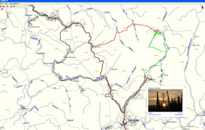 Идея этого маршрута возникла на основе обсуждения гораздо более серьезного внедорожного маршрута на форуме Off Road Master Club (на карте выделен красным).