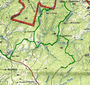 Верх Ики - сразу брод через Ик - высота 339 - грива Платонова - высота 304 - высота 317 - брод через Малую Еловку - мимо высоты 411 - урочище Еловка - брод через Бол. Еловку - далее или подъём на Пихтовый или сначала подъём на г. Каменная - вдоль реки Листвянка - лёгкий подъём на Пихтовый.