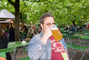 Пивной сад оказался довольно странным заведением. По парку расставлены столы разных размеров, в центре- загородка с раздачей по типу столовых. Заходишь, берешь поднос, набираешь еды, на кассе расплачиваешься. Мы два раза заходили- сначала за едой, потом я -за пивом. За пивом потом не раз повторяли,ес-но :-) За кружку берут залог - 1 евр, вместе с кружкой дают пластмассовый жетончик, потом его вместе с кружкой надо отнести в будку со страшной надписью Deposit Refund, там этот евро обратно отдадут. Собственно еда- не ресторанная, но вполне приличная. Белое пиво из литровых кружек - жить временами бывает не так уж и плохо. Цены, правда, не особо низкие- пиво по 4 евр (на прощальной пьянке в цивильной пивнушке с официантами по 3,3 пили , например). Но за экзотику везде приходится доплачивать, что поделаешь :-) Не смотря на погоду - понравилось.