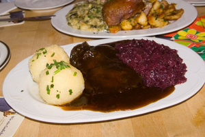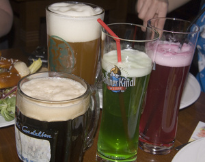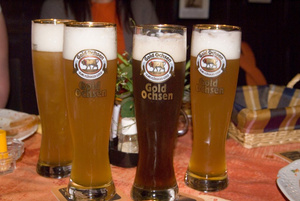 Как-то все то ли устали (хотя с чего?) , то ли еще что- но заказали все совершенно одинаковые колбаски. Обычно мы заказывали два-четыре разных блюда- и друг у друга пробовали :-) Местное пиво - Golden Ochsen - светлое пиво, неплохо- но я уже знал какое пиво мне надо. Заказал пшеничного, вайсбир которое. Но тут за соседним столиком увидел, что мужички пьют пшеничное- но темное! Как заказать- хбз. Ткнул пальцем в соседей- мол, такого же. Мужики не обиделись- поржали дружно :-) Пиво оказалось правильным! Но дункел (или дунклес)- похоже, не именно тот сорт пива, что мне очень понравился - а темное вообще. Во всяком случае, в мюнхене я такого пива не добился. Было что-то похожее в Австрии, но я ,как бедный сруль, не пил его :-(