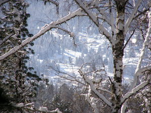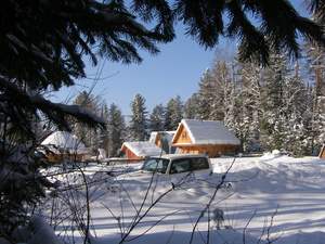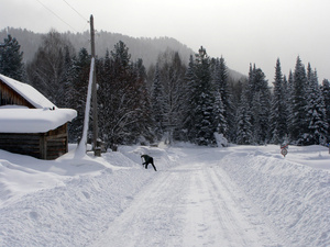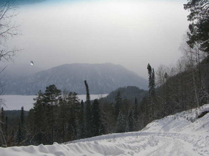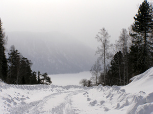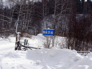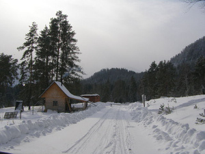 Отпраздновали приезд, приготовили тур. ужин и рано завалились спать…..Наверное уже несколько лет такого сна не помню…В общем проснулись счастливые, до невозможности …Снег шел всю ночь…машину засыпало…Хозяева собирались в этот день к родственникам в Кобезень в 20 км от Артыбаша и попросили подвезти. Часам к 11 утра выехали в Яйлю. Погода хмурая, но настроение клевое. В общем то никаких особых страстей не увидели в плане качества дороги. От Артыбаша до Яйлю 100-105 км , до Бийки где то 85 и от Бийки до Яйлю 20. До Бийки дорога вполне широкая и чищеная, после - узкая. НА наше счастье, несмотря на праздник, дорогу прочистили. Как нам потом объяснили, выборы и делегаты ездят за подписями…поэтому и чистят…а так можно и не проехать….Хотя с подъемом наверх у лесовозов были проблемы, встретили одного, затаскиваемого трактором…. Доехали не спеша за 2 часа. Перед Яйлю шлагбаум, регистрируют машину и говорят , что надо заехать в контору в поселке и зарегистрироваться, а потом отдать пропуск на шлагбауме по пути обратно.