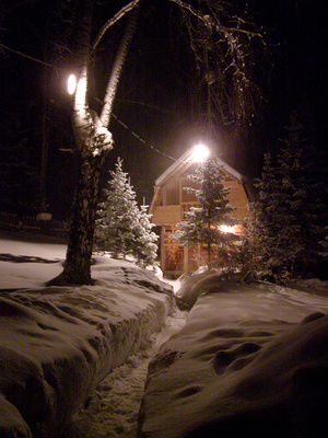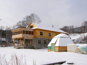 На след день планировали вдвоем выехать на Телецкое, прям с утра. Но, поскольку мужчинам бесплатно в честь праздника обещали полеты на вертолете (вернее на автожире, такая открытая табуретка с пропеллером), а погода была ветреная, решили переждать, спонтанно арендовали группу коней, скатались по полям , лесам, к полудню вроде погода установилась…Нам повезло, как раз пара человек успели слетать ….и снова поднялся ветер….Остальная часть команды оставалась на базе и у них был шанс дождаться погоды, а мы довольные, но уже опаздывающие, двинули в сторону Телецкого. После Горно-Алтайска погода стала совсем никуда, видимость тоже, буран. Временами снижали скорость до 40, в сумерках ехать было тяжело, по дороге встретили 2 завалившихся Камаза, но тем не менее, к семи вечера были в Артыбаше. Несчастные 220 км ехали 5 часов. Нас встретила, как и в прошлом году Ольга –представитель Кедрогора Все - таки мы решили забронировать жилье в Артыбаше, в Яйлю это оказалось несколько проблематичным. То хозяева были не на месте, то дом сдавался по цене на 6 человек. Как показала обстановка и правильно сделали. В Артыбаше, кстати, с местами тоже было не разгуляться по причине фестиваля снегоходов и 23 февраля. Нам нашли домик прямо под горой Тилантуу. Хозяева (местный егерь с женой , ребенком, и кошками, собаками ютились неподалеку в одно-комнатном доме. Такой красоты не часто увидишь, как то базы в основном банальные. А тут, то ли снег хлопьями и тоннели между сугробами, высотой с мой рост местами, то ли освещение, правильно поставленное , то ли место такое и гора…но только усталость от такой красоты как рукой сняло. На улице стоял старый магнитофон , передавали какую то праздничную передачу на волне типа Маяк….