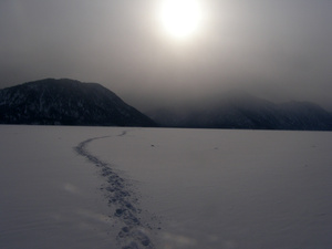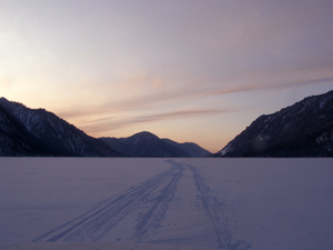 Доехали до шлагбаума, отдали пропуск , пару минут поговорили, мужик подтвредил, что ездят машины , сказал держаться какого то места…мы не очень поняли какого…В общем, поехали через лед …я просто приказала открыть до отказа окна и если, что…. ласточкой вылетать из машины…. Было холодно, но окна я закрыть не дала…Ехали где то 40-50 км в час по накатанным следам по самой середке озера…кругом горы, проплывали мимо слева базы типа Самышей и Эстюбы, хотя до них было еще далеко, так и не поняла , что за жилье...…Жутковато…….Проехали где то 10 км, увидели что следы сворачивают к какому то кордону….причалились, …вышел навстречу веселый такой мужичок…явно какого- то научного вида и навеселе…Радостный такой... Оказалось - это кордон Байгазан в 20 где то км от Артыбаша, и в 10 км от базы Кокаиха. Зовут хозяина Вячеслав, а жену Мирослава, научные сотрудники заповедника и живут на кордоне уже 21 год….Прошли в дом, душевно так побеседовали, взяли координаты, у них есть домики и баня для туристов, катер для экскурсий…... …Следы были вчерашние от Прадо. Это Вячеслав с сотоварищем с клуба Оффроуд приехал вчера с Артыбаша по льду на Прадо, сильно сел где то в 10 км от Артыбаша , в районе кордона Кокаиха, поскольку наледь и плотный снег, долго откапывались….Прадо обратно решил возвращаться через Бийку, надоело копать….Следы вчерашние уже замело, вечерело…Нам пожелали счастливого пути , сказали, где быть осторожными и приготовить лопату…