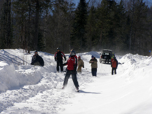 Съездили повторно в район Яйлю с 5 по 8 марта, совместив с поездкой на перевал Обого . В этот раз погода порадовала ярким солнцем, теплом , правда 7 марта задула верховка, и довольно сильно. КРоме того не обошлось без прикллючений в виде завалов на дорогах и откапываний. Те самые "нюансы" про которые я писала выше имели место быть. Не смотря на предвыборную компанию дорогу видимо не чистили каждый день, а поскольку задули ветра, дорогу местами переметает капитально. Небольшими отрезками, кое где даже и небольшими наметами, но достаточно тяжелый и плотный снег, очень быстро заветривающийся, создает для колес без цепей непроходимые условия. Если кто то еще и побуксовал хорошенько, то для последующих машин "каша" непролазная. По дороге на перевальчик перед Телецким втрестили легковуху хотя и 4ВД, забурилась , вытянули. ОКазалось местный депутат ехал на агитацию в Яйлю. Плюнул, развернулся , не стал искать проблемы на 8 марта. ДАлее увидели сноубордистов и лыжников, прямо на дороге, из за ветра на Телецком катание проблематично, решили покататься по целине, прыгая с кромки дороги вниз в овраг , спускающийся к озеру. У шлагбаума несколько машин, сторож вышел уже никакой в честь 8 марта , тщетно пытался сфокусировать глаза на номерах машин!