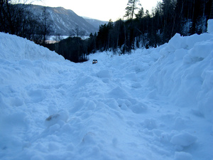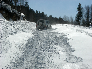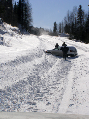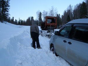 Дороги прсто не было, а с колеи стаскивала вниз на обочину, ведущую в обрыв..Копка и цепи бы помогли, но ухлопали бы на это часа 2 наверное. В общем пока копались, пришел трактор. Мужик , который нас предупреждал был еще более пьян , потирал руки и страшно радовался что мы застряли..., приговаривая, "ну че не едем , да, стом, да, ха ха. эх ВЫ" , в общем смешно.