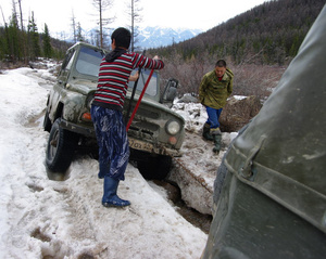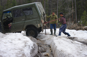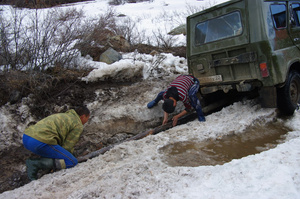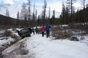 Мы выбирались из лагеря 10 числа. Второй день шел непрерывный дождь, воды много было и в реке и по дороге. Даже уазику порой тяжеловато было..
