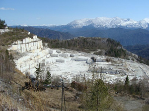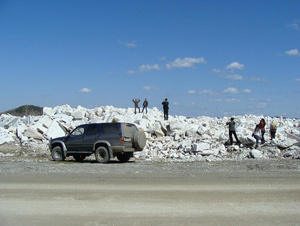 При спуске с горы замечаем место добычи мрамора и его свалку - дефектные куски самых разнообразных размеров и там его просто сотни тысяч тонн - почему бы не перерабатывать в крошку, а не закупать за границей.
