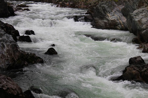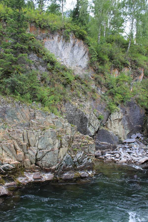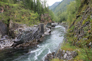 К полудню были в Усть-Кане, через час свернули перед мостом, и начали пробираться вдоль Кумира, оглядывая окрестности – где же Плёсы? Пока везде красиво-бурная река и каменисто-грунтовая дорога. Вроде до Плёсов километров шесть, на этом удалении от моста ничего не обнаружено. Ситуацию прояснил водитель авто с горно-алтайскими номерами – «ещё пара километров». Так и оказалось – ещё более бурный Кумир в этом месте действительно образует небольшие заводи с почти стоячей глубокой водой. Вроде и монашеская обитель давным–давно именно здесь (на противоположном скалистом берегу) стояла, и с этих скал прыгали девушки, спасаясь от злого неприятеля… Красивое место.