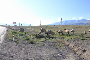 Незадолго перед заставой поймали на себе серьёзный взгляд каменной головы, под Кош-Агачем очередным подарком стало стадо верблюдов. Ночевали в Акташе.