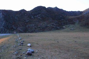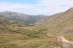 Поехали проведать перевал "Тёплый Ключ", прошли километра три – не понравилась скорость передвижения, которую заметно ограничивали камушки, камни и каменюги. Прошли пару километров пешком – показалось, что самое трудное было уже проехано, оставалась два участка, требовавшие размышлений – на небольшом подъёме на первом прямом участке и после левого поворота в гору. В конце пешего участка, уже ввиду перевала, решили, что проехать можно, но зачем затягиваться на перевал без особых красот – непонятно.