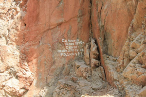 На обратном пути побродили по урочищу Пазырык да по Улаганскому перевалу. На Красных воротах наконец-то сфотографировали надпись, датированную 1946-ым годом (говорят, надпись до сих пор обновляет сын того солдата). Перекусили в Акташе и неспешно покатили на Семинский. На Белом Боме наконец-то нашли тропу наверх, на будущее пригодится.