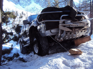 Так вот, цепи надевать в такой ситуации не совсем удобно - достаем ручную лебедку, троса и вытаскиваем моего сурфа на горку.