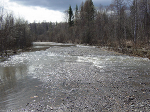 Другое дело сама дорога. Туда ехали через Шарыпово. Дорогу между Кинжиром и Инголем размыло, река Урюп(?) размыла дамбу около моста. Говорили, что уже не первый раз за эту весну. Часа 2 ждали, пока дорожники засыпят прорыв. Засыпали на скорую руку, но не факт, что долго простоит. Пока ждали, попробовали проехать чуть другой дорогой: через Солдаткино, Киргисуль, Юферевское, Лесной, Горячегорск. Но дорога заметно хуже, и в итоге после Киргисуля река пошла прямо по дороге: пару мест я переехал, а очередной брод заставил меня вернуться, глубина (на глаз) больше чем полколеса, и течение. Забоялся в одну машину ехать дальше по такой тайге. И что странно, ati.su прокладывает маршрут именно этим путём: через Горячегорск.