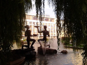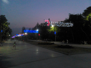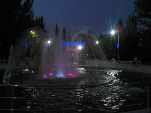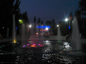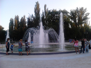 Вечерний танцующий фонтан с подсветкой и сквер очень красивы... Жизнь на районе оживает по вечерам, когда немного спадает зной. Шутка ли - каждый день +28-30 в тени, и дождей весь август не было.