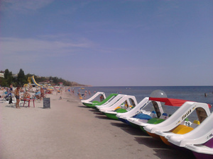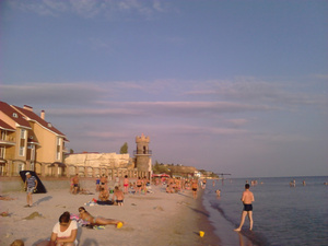 За пять дней в Коблево поджарился основательно. Хотя до загара местных мне далеко. Местечко это весьма популярно, здесь много приезжих издалека - из Молдовы, Белоруссии, даже болгарские номера машин попадались. Россиян тоже хватает. Здесь много отелей, пансионатов, баз отдыха на любой вкус и на любые деньги. Пляжи широкие, песчаные. Часть их чистят чуть ли не каждый день, но большинство все-таки грязновато. Впрочем, для Украины последнее - норма по моим впечатлениям. Белоруссия на порядок чище.