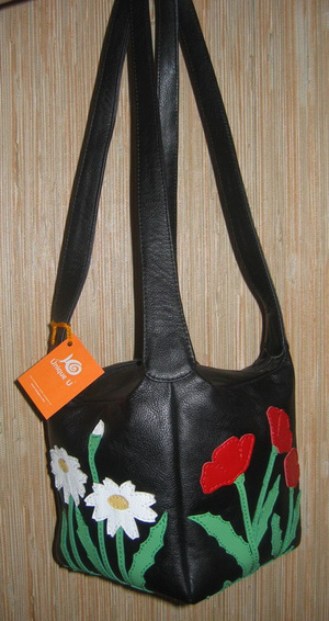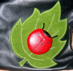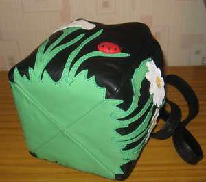 Дно у этой сумки - зелененькое, цветы как будто из травки и растут:) Божья коровка - объемная, на фото не очень видно.