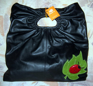 "Фреш-божья коровка". Вариант, как видите, только для ношения в руке. Такая сумка... комильфо, что называется. Традиционный черный цвет вроде бы, а за счет необычной формы и аппликации смотрится интересно.