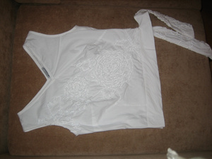 Топ классический белый 100% хлопок впереди очень интересно сделана аппликация из той же ткани, сбоку завязки, р-р38 европейский. Покупала в Чехии, отдел немецкой одежды за 1500,00 Надела 1 раз и поняла - мне немного маловат... Уступлю рублей за 800