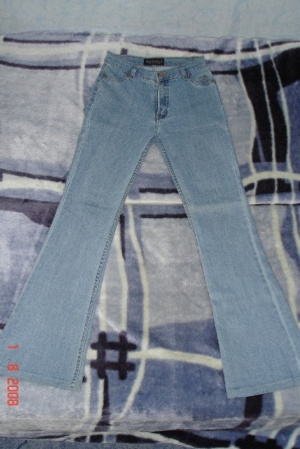 Голубые: посадка чуть-чуть заниженная, р-р 40-42 (но на мои бёдра 91 см - малые), аккуратно подшиты на рост около 158 см, поэтому почти прямые (клеш отрезался). На фото цветопередача не совсем хорошая, на самом деле цвет очень приятный сине-голубой. Почти классика - без потертостей и "излишеств" (страз, вышивок и пр.). Состояние - отличное, одевались пару раз.