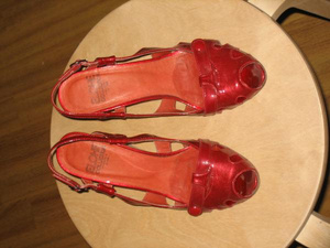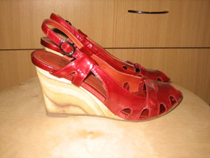 Продам босоножки: красный лак, деревянная танкетка, размер 36. Куплены в Аскании. Надевала раза 3. Как оказалось, переоценила свои силы - каблук для меня слишком высокий. Очень хорошо смотрятся - просто отрываю от сердца! Цена 600 р., в подарок воск (как мне сказали в магазине, им надо обрабатывать танкетку, чтобы дольше сохранила вид)