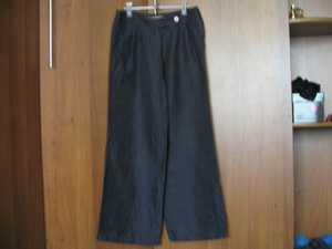 темно-синие шаровары на бедрах, р-р 42, укороченые. Защипы на поясе. Карманы прорезные. Материал лен, но они как шелковистые на ощупь, легкий блеск. 300 рэ