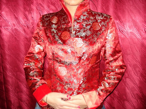 И ещё в наличии атласный пиджак в китайском стиле, привезли оттуда, но размер большой. Он идёт на 44-46..Скорее 46. Отдам всего за 500 рэ. Смотрите фотку, очень красивая вышивка, абсолютно новый, на шелковом красном подкладе, и с однотонными красными манжетами.