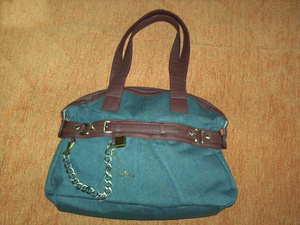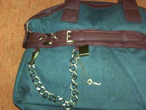 Модненькая, снаружи два джинсовых кармана, прикольная цепочка и настоящие ключик и замочек. Внутри кармашек под сотовый и один карман на замочке. Размеры примерно 42 Х 30 Х 14.