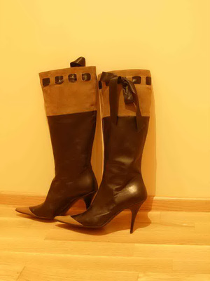 2. Сапоги на шпильке, комбинация черной кожи и светлой замши. Острый нос. Шпилька сантиметров 8. На голенище вдета черная атласная лента, завязывается на бант сбоку. Очень красивые, тоже из океана.