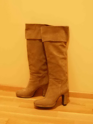 1. Высокие сапоги из светлой замши. Подошва 2 см, каблук примерно 8-9 см.