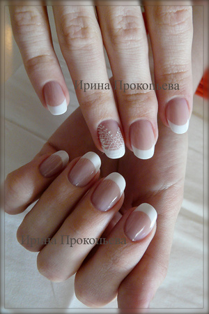 Укрепление своих ноготков, френч и кружево на 1 пальчик. Длину ноготков кое-где корректировала, тк свои не все были одной длины.