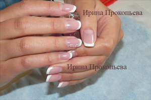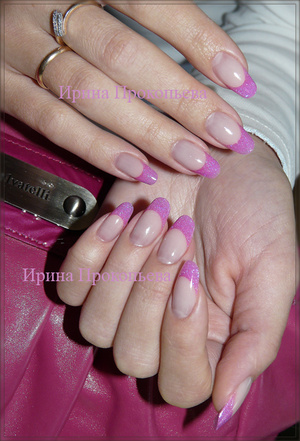 Розовый френч с уменьшением натуральной ногтевой пластины. Девочка любит по долгу ходить с ноготками.