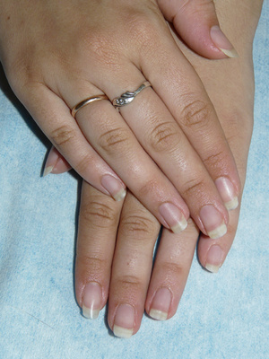 Я бы тоже рекомендовала не увлекаться отрыванием ногтей палочкой. Это очень травматично для своих ногтей. Там где есть отслои ногти отойдут легко, а в других местах сорвете вместе со своей пластиной. У меня есть клиентка, которая любила отрывать ногти палочкой, как раз гелевые. У нее после этих отрываний свои превратились в тряпочку. Она когда ко мне пришла первый раз, я ей свободный край толком запилить не могла, они гнулись как капроновые. Если этим методом воспользоваться единовременно, то особого вреда не ощутите. А вот если наращивать каждый месяц и сдирать их. Тогда результат не заставит себя ждать.многие смотрят на фотографии, вроде нравится, но что получится на себе не понятно. Для примера выставляю фото "До" и "После" на ножках - френч укрепление своих ноготков.