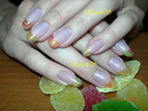 я, честно говоря, не любитель всяких фруктов-цветочков, но в данном исполнении (когда они разложены по краю ногтя) очень даже мне понравились!