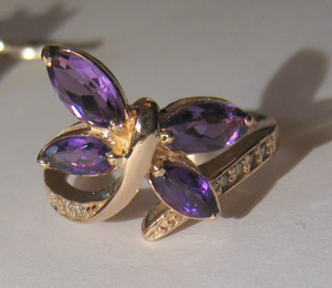 Колечко с бабочкой - аметисты, бриллиант - 6500. Дизайн этого колечка - уникальный, сами придумывали. Считайте - единственное в мире